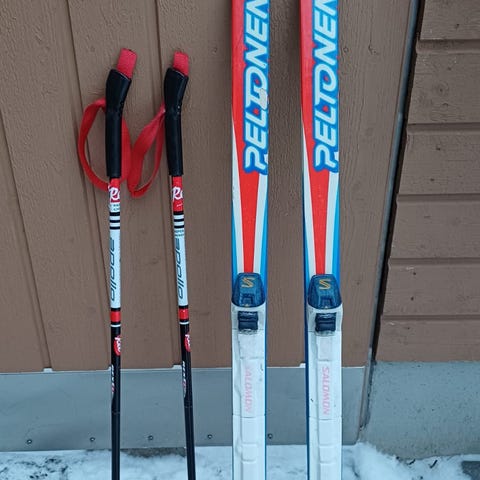 Lasten Karhu suksisetti, NNN-siteillä. Käytetty kunto. Sukset 130cm, sauvat 95cm. Vain nouto Etelä-Haagasta.