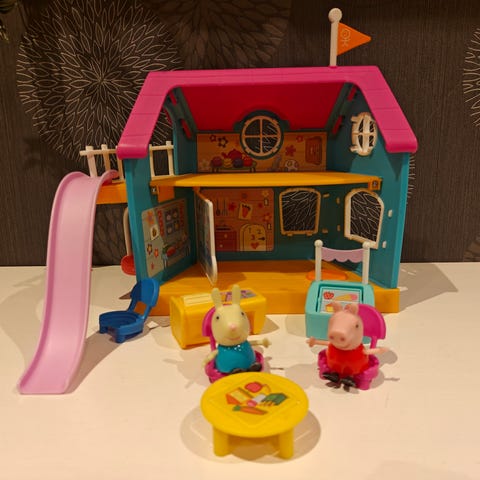 Sisältää Pipsa possun talon, supermarketin, maailmanpyörän ja lääkintälentokoneen. Lääkintälentokoneen kille -kilpikonnan kattoluukku on hukassa, jos löydän, niin saa mukaan. Lääkintäpipsan toinen jalka on katki. Supermarket on paljon leikitty ja käännettävät kauppakortit jo hyvin kuluneet. Hissi toimii. Maailmanpyörä ihan ehjä. Talosta en tiedä onko kaikki osat tallessa, mutta ainakin saa kasaan vielä. Huomasin, että joltain oli katkennut toinen käsi.