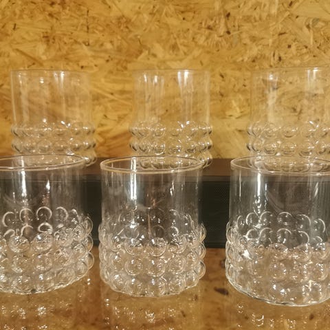 Myydään kuvan ehjät siistikuntoiset Nanny Stillin suunnittelemat Riihimäen Lasin Grappo lasit. Korkeus 11cm, halkaisija 4.5cm, tilavuus 16cl. Näitä 6 kpl ja hinta kaikista yhteensä.
