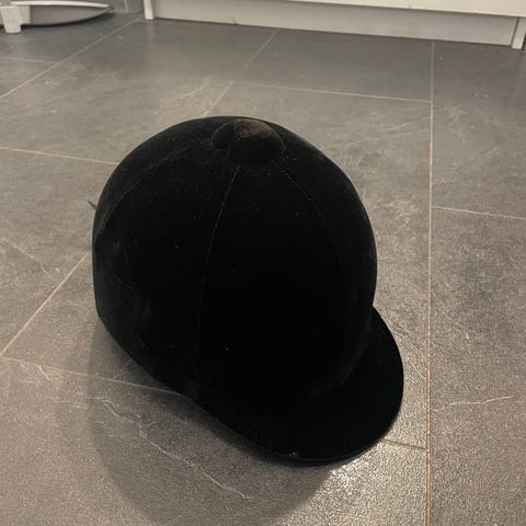 Ratsastuskypärä mustalla samettipäällysteellä. Kypärässä on pehmustettu sisäosa ja säädettävä leuka- ja niskahihna. Takana koristeellinen rusettinauha. En muista tarkkaa kokoa, mutta sanoisin S/M