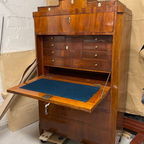 Muuta: Tämä alun perin meklarille valmistettu kirjoituslaatikko tai ”matkasihteeri” oli suunniteltu erityisesti huutokauppameklarin liikkuvaan työhön. Meklarit tarvitsivat kompaktin, helposti kuljetettavan työpisteen, jossa he saattoivat laatia myyntiasiakirjoja, kirjata tarjouksia ja säilyttää tärkeitä dokumentteja turvallisesti. Laatikon kalteva ja arvokas nahkainen kirjoituspinta tarjosi tyylikkään alustan nopeatempoiseen kirjaamiseen ja vetolaatikko aukeavine kansilevyineen oli oiva paikka säilyttää tarvikkeita, arvopapereita, ja maksukuitteja. Viktoriaanisella aikakaudella tällaiset viistot kirjoituslaatikot olivat sekä käytännöllisiä että statusta viestiviä esineitä: laadukkaat materiaalit ja huolellinen viimeistely kertoivat omistajansa asemasta ja ammattitaidosta.