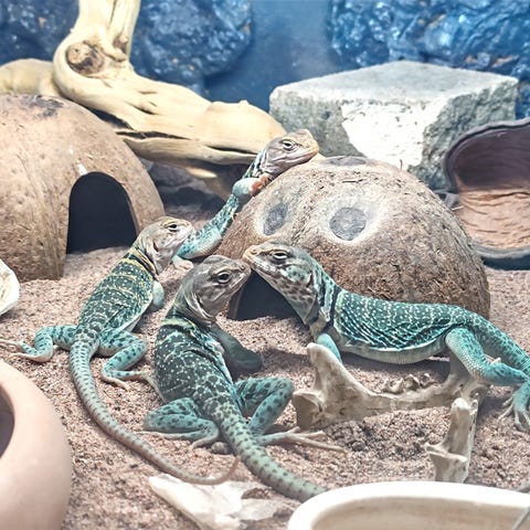 Crotaphytus collaris (kaulusleguaani) koiraspoikanen. Valmis uuteen kotiin, kuoriutunut 8/2025. (Viimeisessä kuvassa isä, siitä näkee aikuisvärin.)