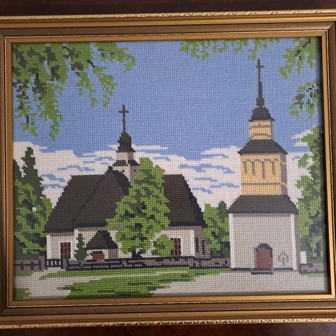Peräseinäjoen kirkko kanavatyö. Taulun koko kehyksineen 36 cm x 48 cm. Kanavatyön päällä mattalasi suojana, taulu kehystetty kehystämössä.