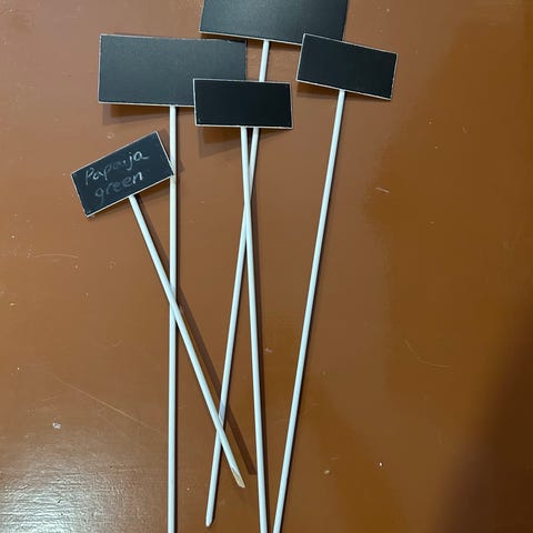Kylttitikut, joissa musta liitutaulupinta. Setti sisältää viisi kylttitikkua, jotka sopivat esimerkiksi kasvien tai muiden kohteiden merkkaamiseen.