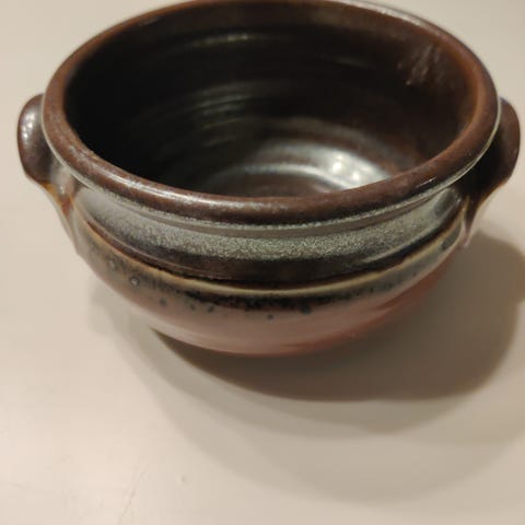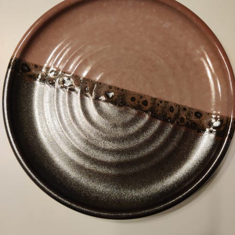 Kustavin Saven tarjoilukulho. Väri roosa/ruskea. Astian reunassa reikäkuvio. Halkaisija 24 cm, korkeus 8 cm.