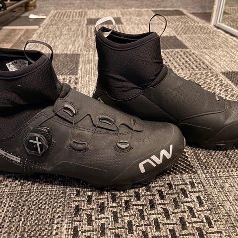 Käytetyt, mutta edelleen hyvin palvelevat syys/talvipyöräilykengät. Omat jalat tarkenee näissä vielä muutamassa pakkasasteessa, mutta minulla ei ole kovin hyvä ääreisverenkierto. Kenkien vuori on kulunut hieman kantapään kohdalla, mutta paikat ovat korjattu FabPatch vaatelaastarilla ja en ainakaan itse huomaa mitään haittaa tästä.