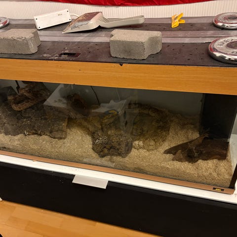 Viljakäärme ja terraario tarvikkeineen.