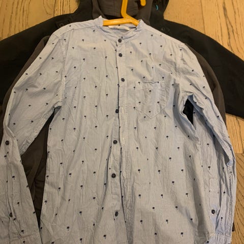 Juhlapaita ja mustat farkut 164, valkoinen kauluspaita Luhta kokoa 160. Mustat farkut H&M kokoa 164. Molempia käytetty juhlissa.