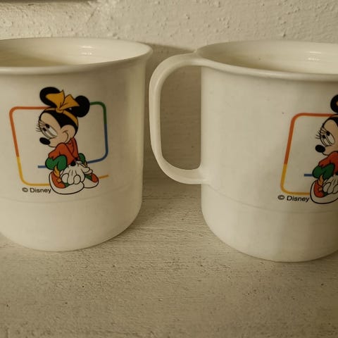 Myydään kaksi Tupperwaren Disney Mikki Hiiri -muovimukia.