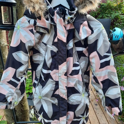 Lasketteluun sopiva Takki. Mukavasti taskuja. Povari. Karvan saa irti hupusta ja koko hupun irti. On kohtuu paksu. Ei mikään pelkkä kuoritakki. Kiristysnauhoja. Takki on uusi, laput kiinni. Väri mielestäni limen vihreä. Jonkun miekestä voi mennä keltaiseen.