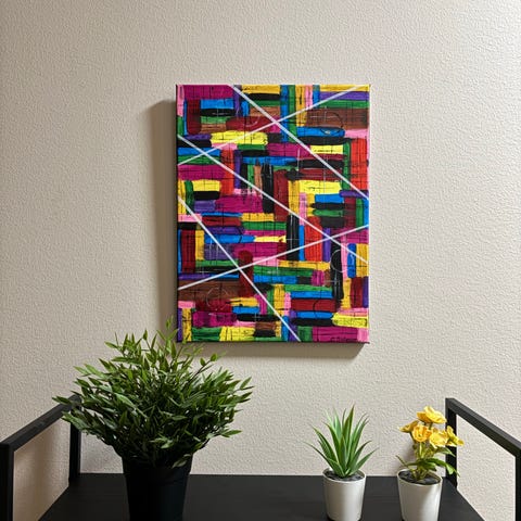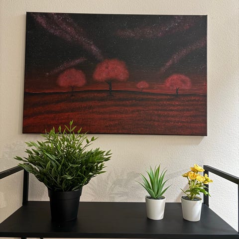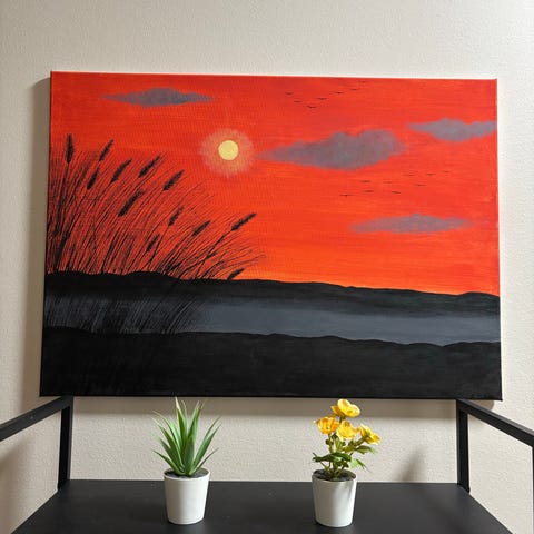 Maalaus, jossa kuvattuna punainen auringonlasku ja maisema. Reunat ovat mustat. Koko 30x40cm. Tarjoa hintaa!