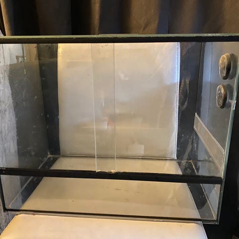 Iso ja vanha terraario. Suomessa valmistettu. Toisessa päällyslasissa särö joka päällystetty silikonilla. Terraarion toisessa reunassa tasanne. Tyhjään ennen noutoa, parempi siivous jää ostajalle.