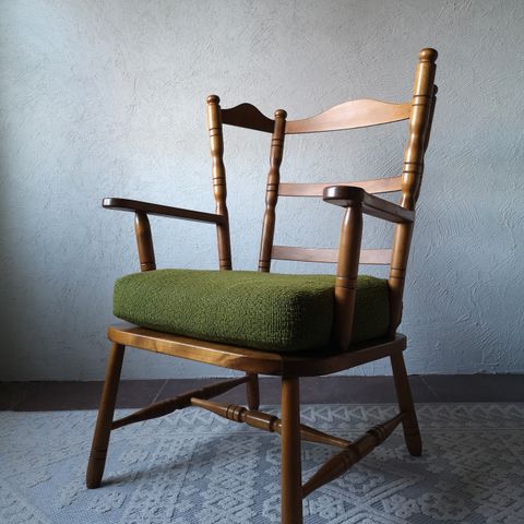 Iäkäs nojatuoli Borgilta. Tämä muhkea nojatuoli on peräisin kartanosta Porvoosta. Näyttävä sinapinkeltainen kangasverhoilu. Tästä valopilkku sisustukseen!