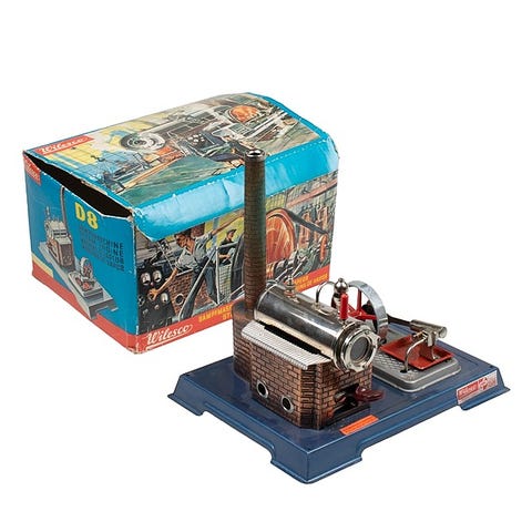 Wilesco D 16 on perinteinen, toimiva mallihöyrykone, jossa on kiillotettu messinkikattila ja kaksitoiminen, kiinteä sylinteri. Höyrykone on asennettu lakattuun siniseen metallipohjaan, josta kohoaa tiilikuviota jäljittelevä piippu ja liesiosa.Mallissa on turvaventtiili, venttiili höyryn säädölle sekä polttimonsija. Vauhtipyörän halkaisija on suuri.Tuote on testaamaton.Valmistaja: WilescoMitat (LxKxS) ovat noin 31 x 20 x 25 cmVäri: sininen, hopea, punainen, musta, kupariMateriaali: metalli