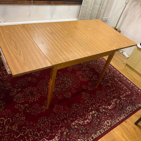 Pöydässä on näkyviä kulumia ja maalipinnan lohkeamia, erityisesti reunoissa ja jaloissa. Pinta on naarmuuntunut, mikä kertoo sen käytöstä ja iästä.