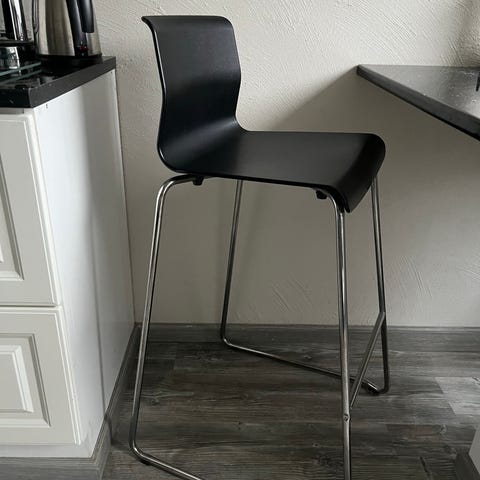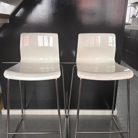 Kaksi valkoista Ikea Glenn malliston baarijakkaraa, joissa on metalliset jalat. Pinottavissa. Tuolit ovat yksinkertaisen modernin muotoilun mukaisia ja sopivat hyvin erilaisiin sisustuksiin.