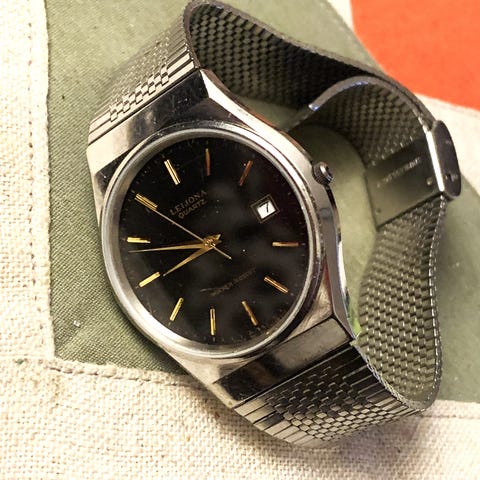 Leijona rannekello. Kultaisen värisessä pientä kulumaa rannekeessa mutta muuten tosi siisti kuntoinen ja täysin toimiva. Kaikki palat tallella. Vedenkestävyys 30m. Tarjota saa