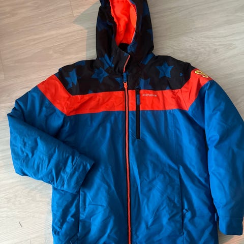 Lämmin takki, koko 164cm, mutta hihat sen verran lyhyet että laitoin pienemmän koon. Alle mahtuu helposti lisävaatetta, reilu malli.