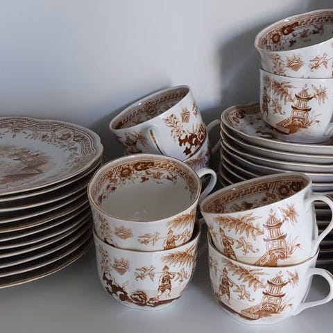Otsikon mukainen kunnoltaan uutta vastaava kahviastiasto. 10 kpl kuppeja+asetteja, yhteensä 85,- (myydään kokonaisuutena) sekä 8 kpl voileipäasetteja 60,- (myydään kokonaisuutena).