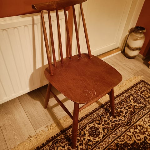 Kaunis tuoli, joitain käytönjälkiä pinnoilla mutta rakenteeltaan erittäin hyvässä kunnossa. Tukeva. Pehmustettu istuinosa.