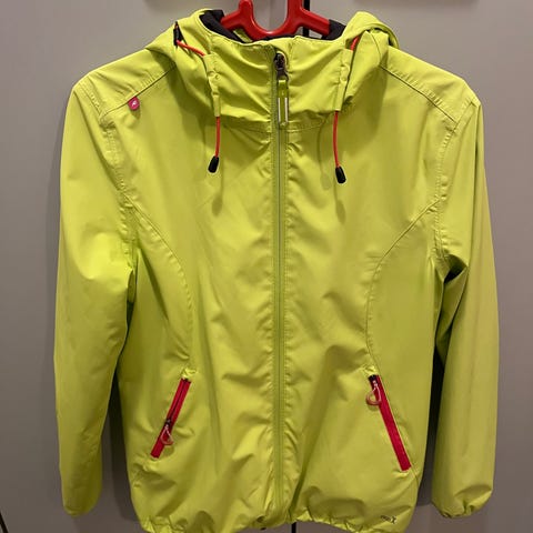 Vihreä naisten ulkotakki, koko 38, valmistettu polyesteristä. Takissa on hupullinen malli ja se sopii erilaisiin ulkoilutarkoituksiin. Takissa on ylhäältä ja alhaalta aukeava vetoketju.