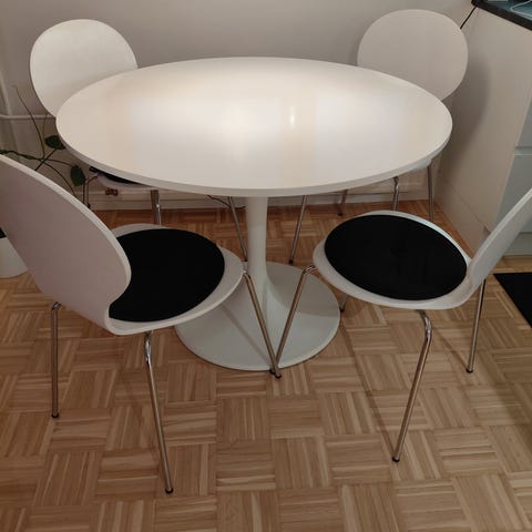 Kuvan mukainen jyskin pyöreä ruokapöytä kaupan. Hyväkuntoinen. Purettuna joten myyjän kuva.