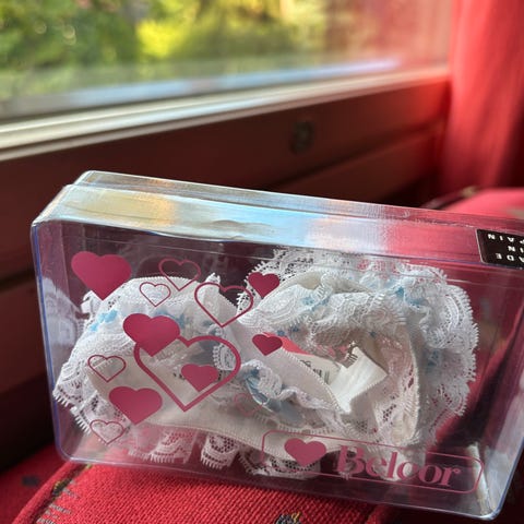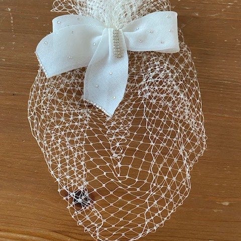 Hääasusteet, valkoinen hiusverkko rusetilla ja 2 häälaukkua