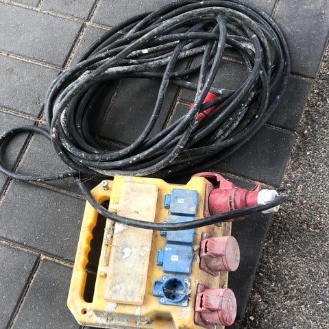 Kempten työmaakeskus 32A. Keskus on ollut käytössä sisällä yhden työmaan ajan. Mukana myös liitosjohto. 4 X 230V, 1X 32A ja 1 X 16A.