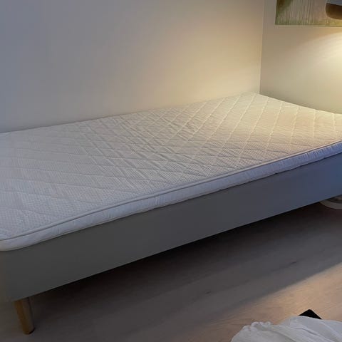 IKEA Skårer sänky, jossa vaalea verhoilu ja jalkojen materiaali tummaa puuta.