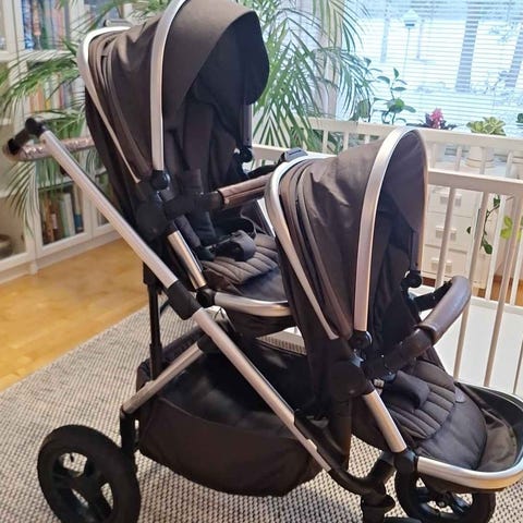 Sisarusrattaat vuoden käytössä olleet ainoina kulkupelinä.Käytön jälkiä näkyy ,pestyt rattaat mutta kaikkia likaa en saanut pois niin kuin kuvassa näkyy kuomussa on tahra.Kuljetus onnistuu lähialuille.