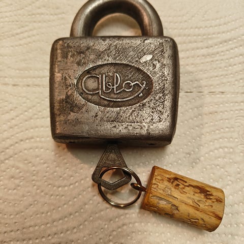 Abloy lukko pienellä sangalla. Yksi avain.