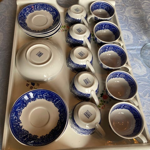 Reinhard Richterin suunnittelemat Arabia Maisema kahvikupit ja aluslautaset. Kruunuleima. 8 paria ja 2 aluslautasta kaupan päälle, joissa pienet lohkeamat. Kahdessa kupissa pienet lohkeamat, jotka näkyvät kuvissa. Kupin korkeus 4,5 cm, halkaisija 8,5 cm. Asetin halkaisija 13,5 cm. Nouto Ylöjärvi.