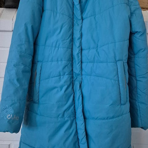 Turkoosi/vaaleansininen, koko 38, siisti ja vähän käytetty, huppu, hihoissa sisäresorit.