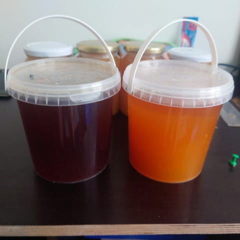Myydään viime kesän hunajaa varasto tyhjäksi 1000 g pikkuämpäreissä, 10 € / kpl.