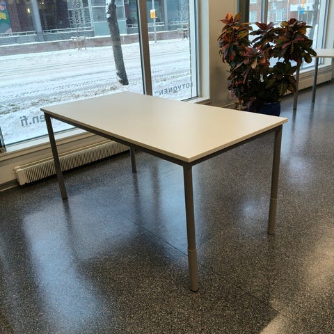 Ikean työpöytä. Koko 140x140. Keskellä johto pistorasia luukulla. Tukeva pöytä. Valkoinen.