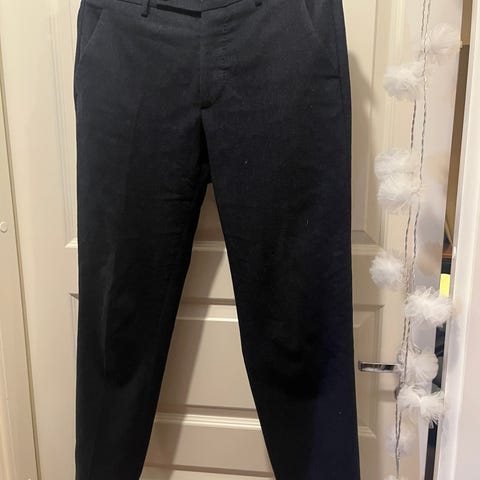 Hiilenharmaat Berwichin housut, koko 50. Materiaalina tiiviisti kudottu ohut ja laskeutuva villakangas, joka tarjoaa lämpöä ja mukavuutta. Sivukiristimet napeilla.