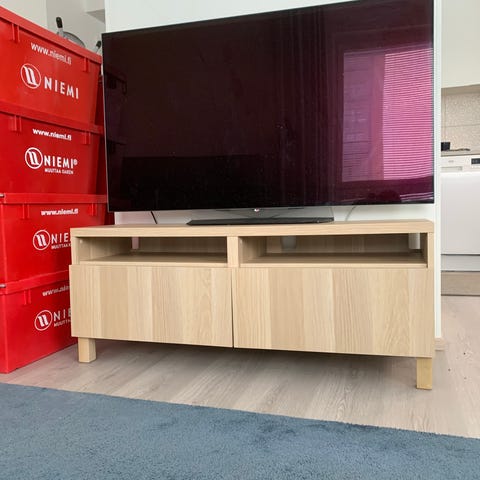 Hyvässä kunnossa oleva tv-taso! Lukolliset ovet, avain tallessa. Yks lommo tuli kasatessa, ei kuitenkaan erotu ellei osaa etsiä "virhettä". Lommosta kuva.