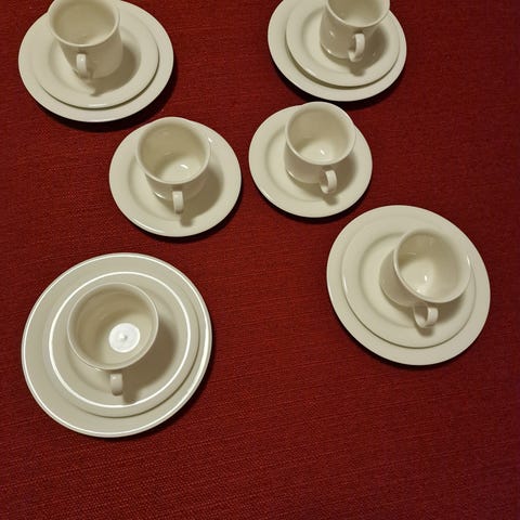 Arabia kahvikuppisarja, joka sisältää viisi kahvikuppia ja lautaset sekä kermanekan.