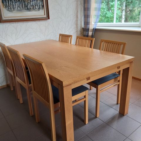 Tammi ruokapöytä ja kuusi tuolia