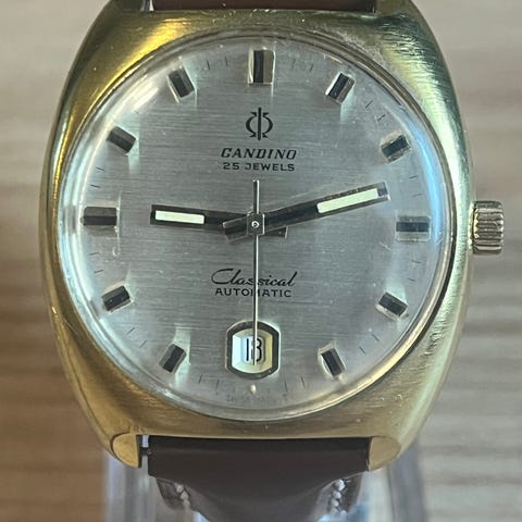 Kuvien sekasikiö, junghanssia ainakin taulu, kuoret ja ranneke on candino. Koneisto eta 2824, toimii hyvin mutta huolloista ei ole tietoa. Halkaisija ilman nuppia n. 38mm, erikoisen ohut automaatiksi n. 9,5mm. Ranneke sopii löysästi 19cm ranteeseen. Ulkoisesti mielestäni siistikuntoinen, pientä naarmua tietysti löytyy ja lasissa ihan pientä hiertymää.