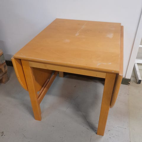 Kevyt mustarunkoinen ruokapöytä ja neljä tuolia, pöyä jatkettuna 75x120 cm, kasassa 75x75. Pöydän pinnassa muutama haalea naarmu, muuten hyväkuntoinen.