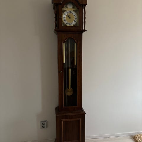 Kaappikello, jossa puurunko, painot ja heiluri. Kellon runko on tumman puun värinen, ja siinä on lasiovellinen alaosa. Kello sopii sisustukseen, jossa arvostetaan. Sijaitse Halsilan