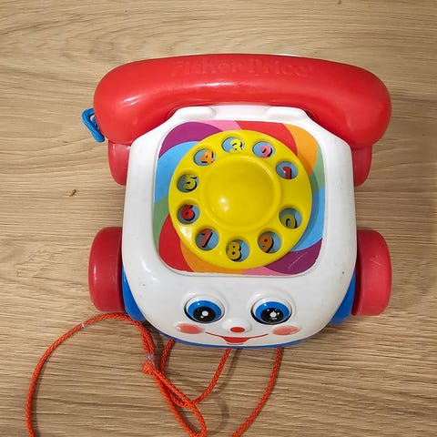 Fisher-Price Chatter Telephone lelu puhelin, värit punainen ja valkoinen. Valmistettu muovista. Lelu on tarkoitettu lapsille leikkikäyttöön. Mattel 80 v tuote.
