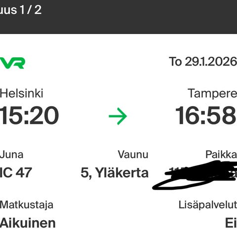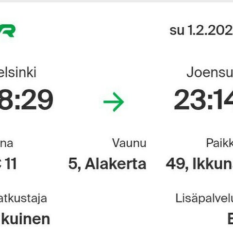 Myydään aikuisen junalippu Tikkurilasta Joensuuhun ja tarvittaessa Uimaharjuun asti. Menomatka Tikkurilasta 1.2.2026 7:11-11:36. Jatko Joensuu - Uimaharju 11:54-12:29.
