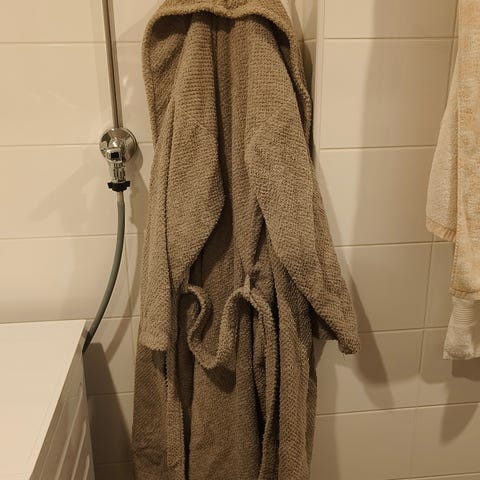 Billebeinon punainen One Size kylpytakki. Mallissa vyö, huppu ja taskut. Sopii unisex-käyttöön. Vähän käytetty, eli hyvässä kunnossa.