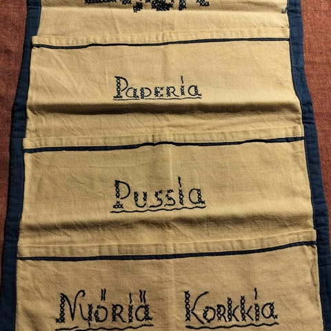 Taskupussi on vuosikymmeniä vanha. Tätini tekemä. Koko 36 cm x 54 cm. Tämä on ehjä , puhdas siisti ja hyvä. Myynnissä myös toisen tätini tekemä melkein samanlainen. Katso myös muut kohteeni. Nouto Tampereen keskustasta tai postitus 4 euroa.