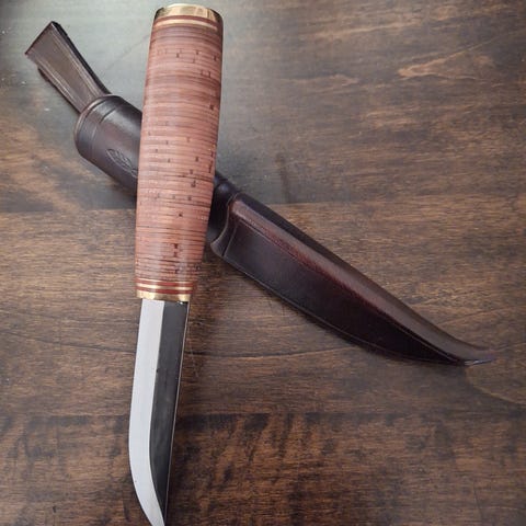 Joulupakettiin vanha hyväkuntoinen puukko puukahvalla ja -tupella