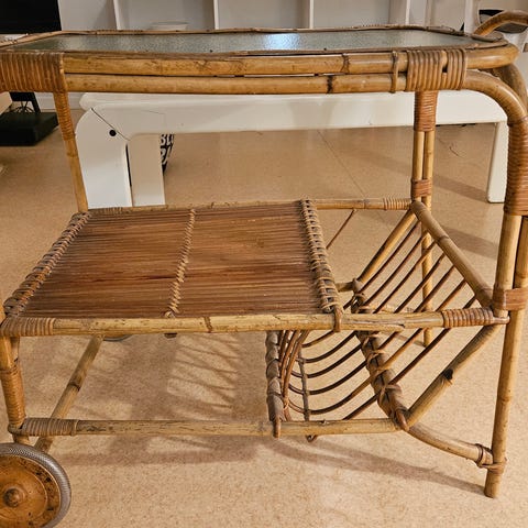 Vanha tarjoilupöytä jossa ajan patina näkyy. Monet juhlat juhlinut ja nyt aika levätä. Kolhuja on matkalla tullut ja renkaan punoksissa sanomista on. Taittuva pöytä jossa tarjottimia voi erikseen käyttää. Kaikinpuolin hieno on.