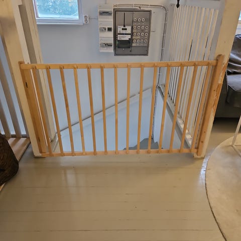 Lascal ruuveilla kiinnitettävä turvaportti. Toimii ja kaikki on mukana, mutta on jo kuluneen näköinen.