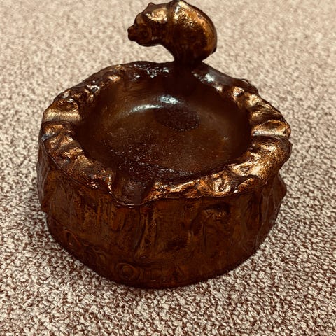 Mäntysen upea tuhkakuppi joka meillä on palvellut korukulhona. Halkaisija n 13cm,pronssia. Myös nouto sopii